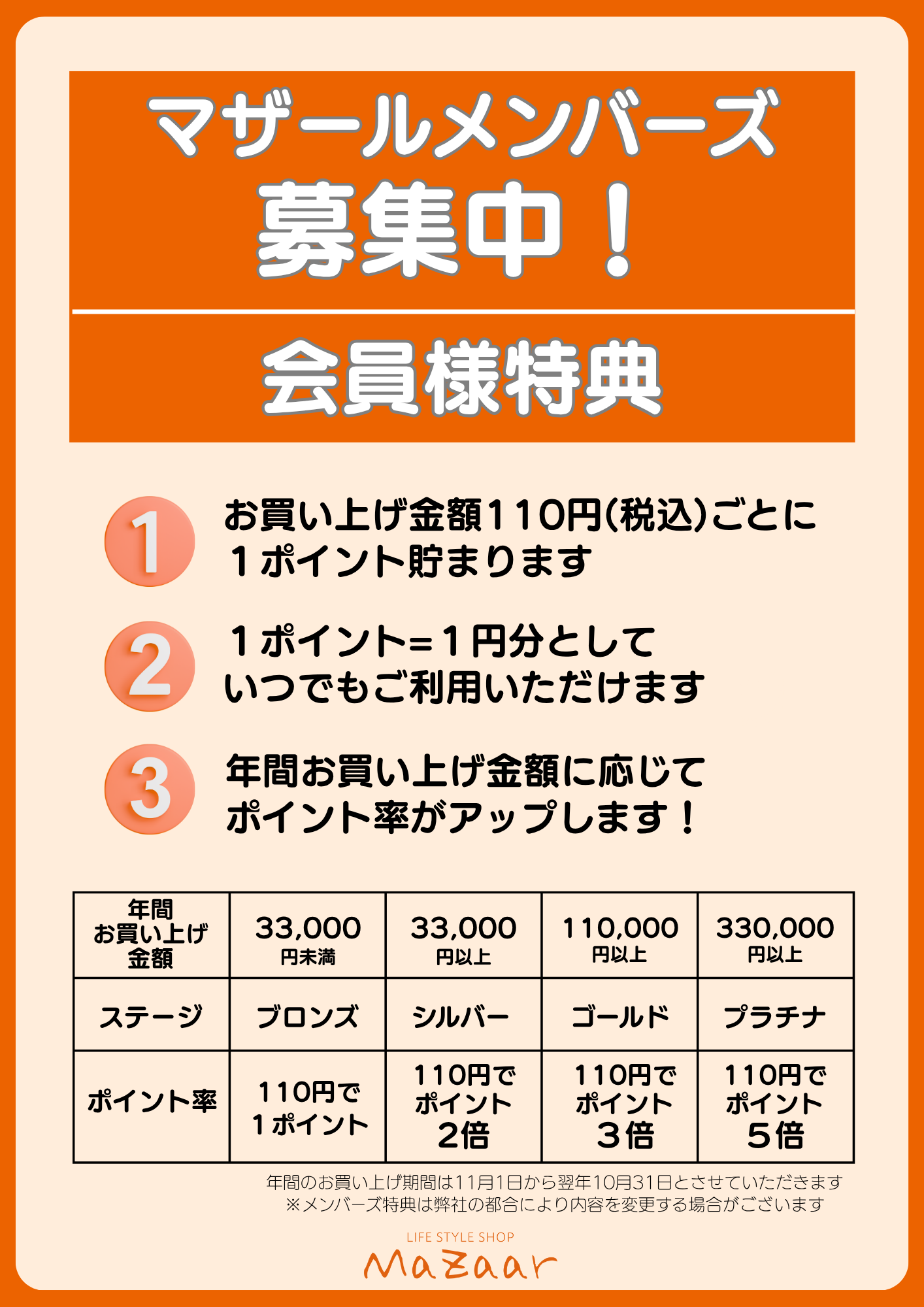 ポイントが貯まって使えるほか、年間のご購入額に応じてポイント率がアップします。